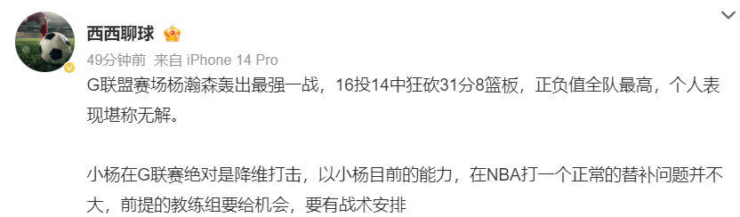 但有一位开拓者球迷写道:没用的,就算杨瀚森在G联赛拿到100分也没用,因为开拓者主帅斯普利特是一个低智商、愚蠢的主帅,他不会给杨瀚森机会的。